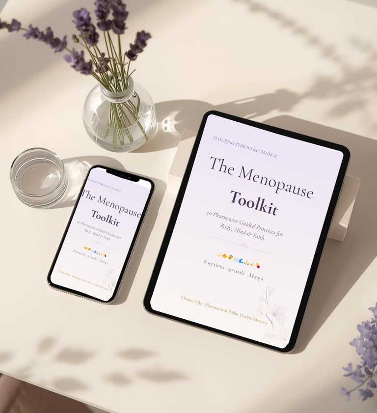 The Menopause Toolkit is an interactive digital app containing 50 pharmacist-guided, faith-centered practices — organised by how you feel in the moment.